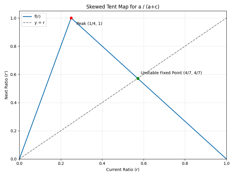 Map governing update of 1RB---_0RC0RD_1LD1RB_0LE0LC_1RA0LF_1LD1LE (bbch) r stat in the limit. It is a Skewed or Asymmetric Tent Map.