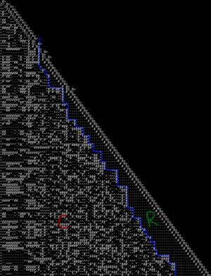 "The left side is just bouncing around a 1212... pattern, nothing interesting there. But the right side has this extremely peculiar 'binary counter'. Since the head never moves more than a fixed number of cells (3, but effectively only 1) from right to left before finally resetting, we know that all information must flow from left to right. Therefore, it acts somewhat like a binary counter, in the sense that each cell must follow an eventually-periodic pattern as long as the machine doesn't halt, and that period is a non-decreasing power of 2. But as we look further to the right, the pattern actually gets more and more complex, as opposed to the trivial back-and-forth flipping of a real binary counter. The attached program calculates the pattern for each cell, as a function of the previous cell's pattern; by cell 99, the pattern is 11531 lines long. My current hope is in how repetitive the pattern appears; it often has just BBBB..., CCCC..., or ADAD... for hundreds of lines straight. So it might be bounded in how much information it actually contains, which would open a pathway for proving it non-halting."
